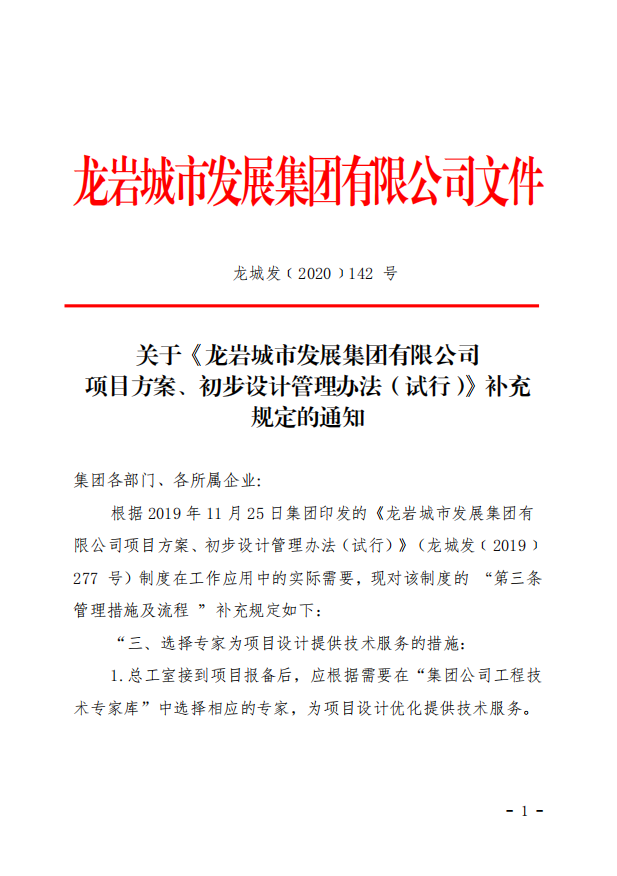關(guān)于《龍巖城市發(fā)展集團 有限公司項目方案、初步設(shè)計管理辦法(試行)》補充規(guī)定的通知